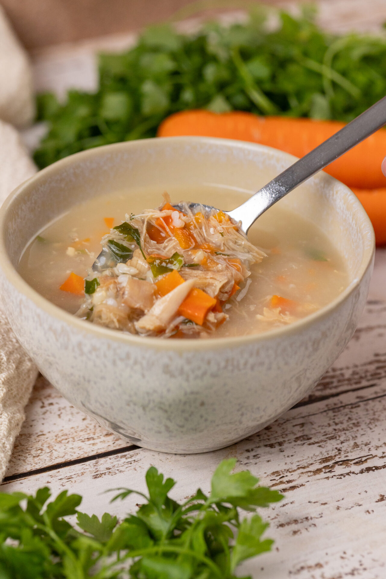 Lista de Ingredientes: Frango sem antibióticos, caldo de frango rico em colágeno, arroz cateto integral, cenoura orgânica, cebola, salsa orgânica, alho, sal e louro.